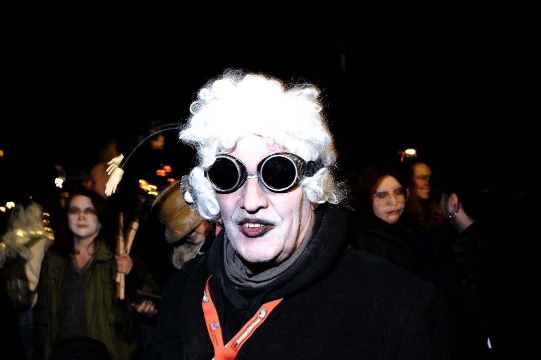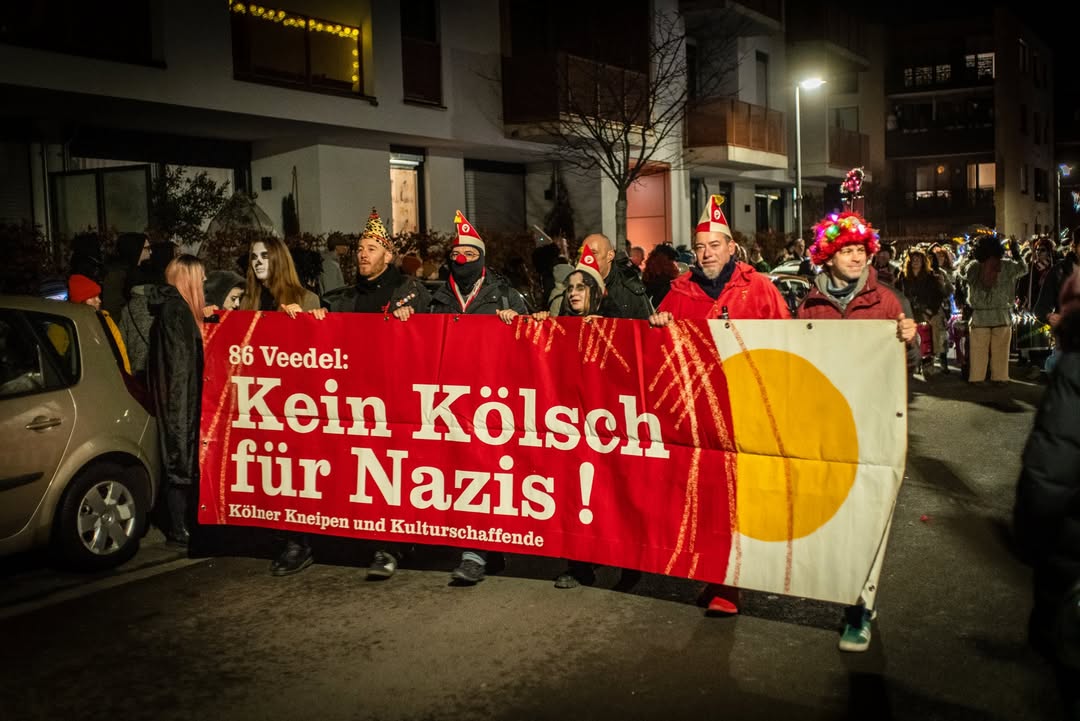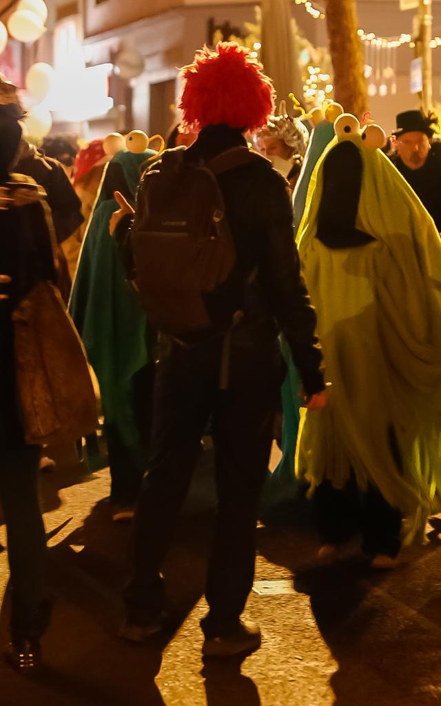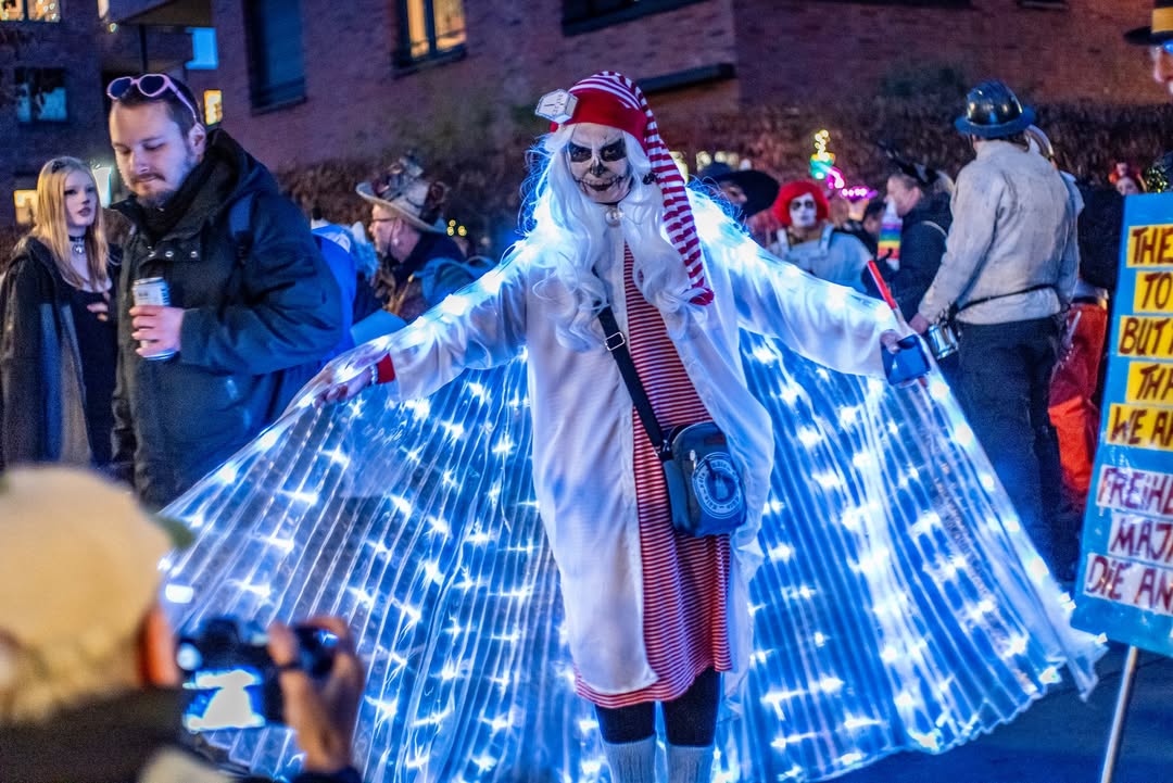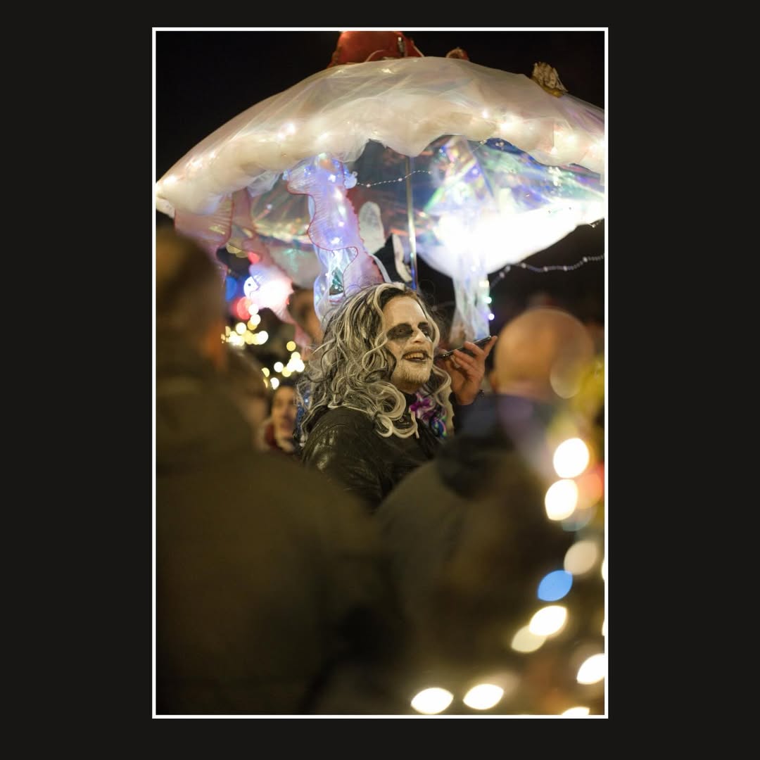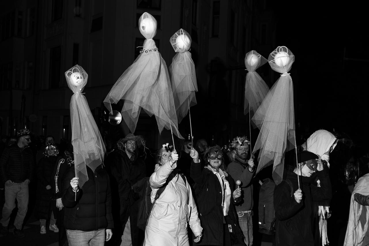 Zwischen 15 und 20 Fotograf:innen haben sich um 19 Uhr in Nippes zusammengefunden – und sich dann schnell im Strom verloren. Jeder auf der Jagd nach dem eigenen Moment. Gruselige Kostüme, schräge Verkleidungen, Lichtinstallationen direkt am und um den Körper, laute Musik, und zwischendrin Transparente gegen steigende Mietpreise. Köln halt. Aber Köln auf 180.