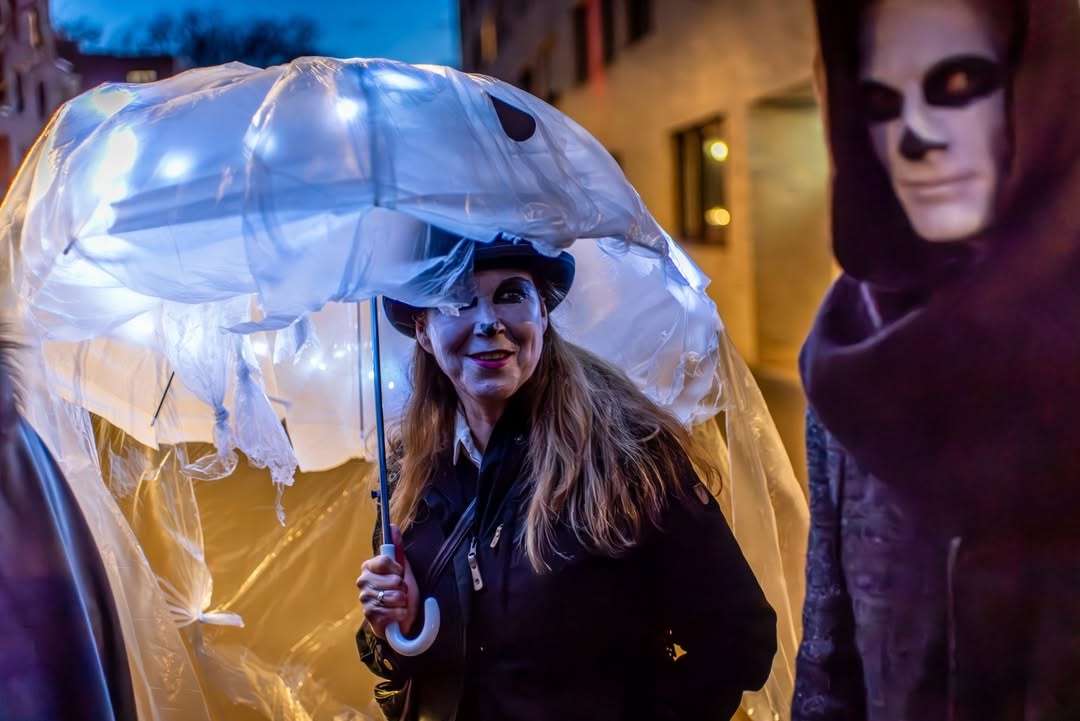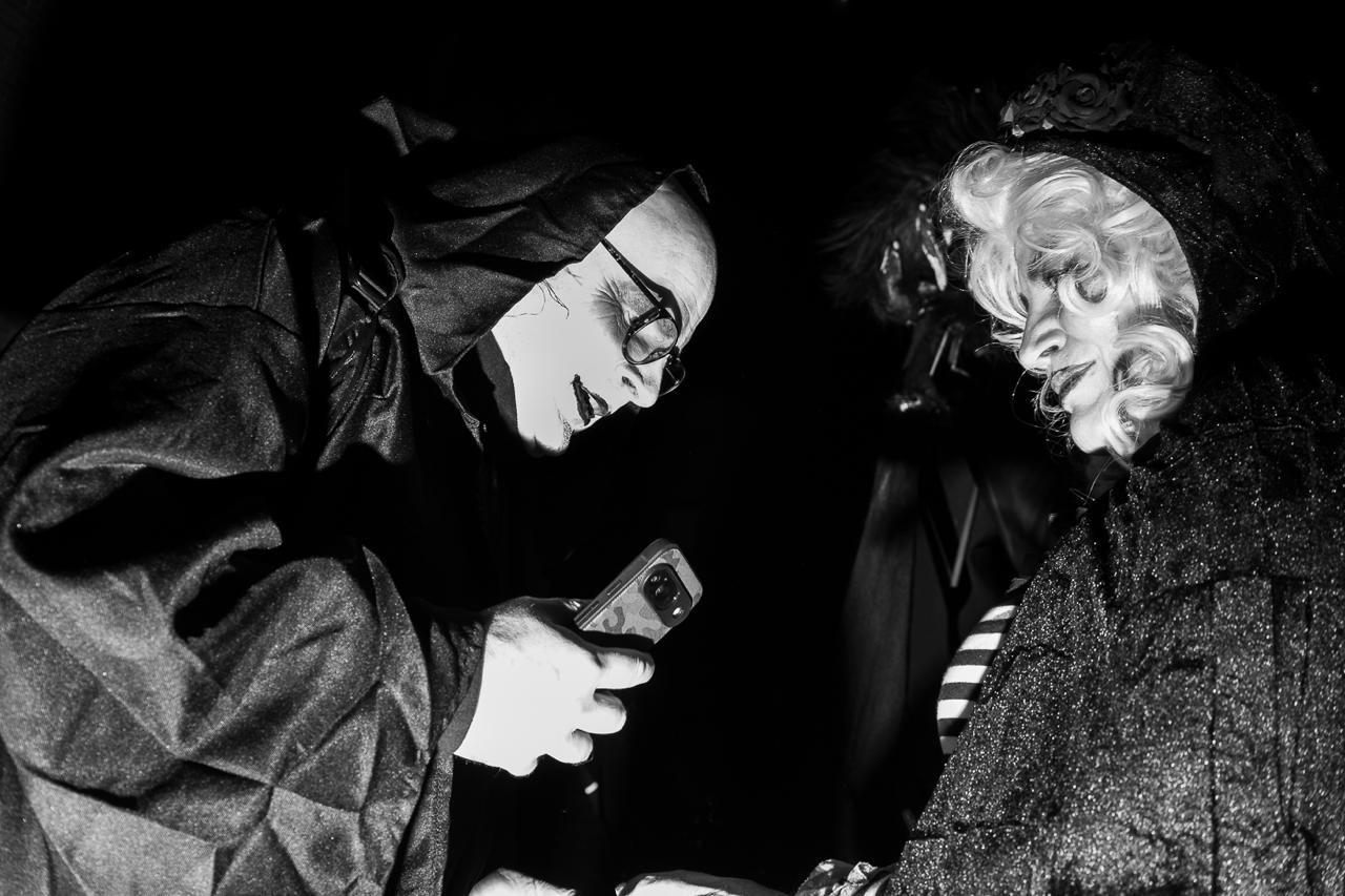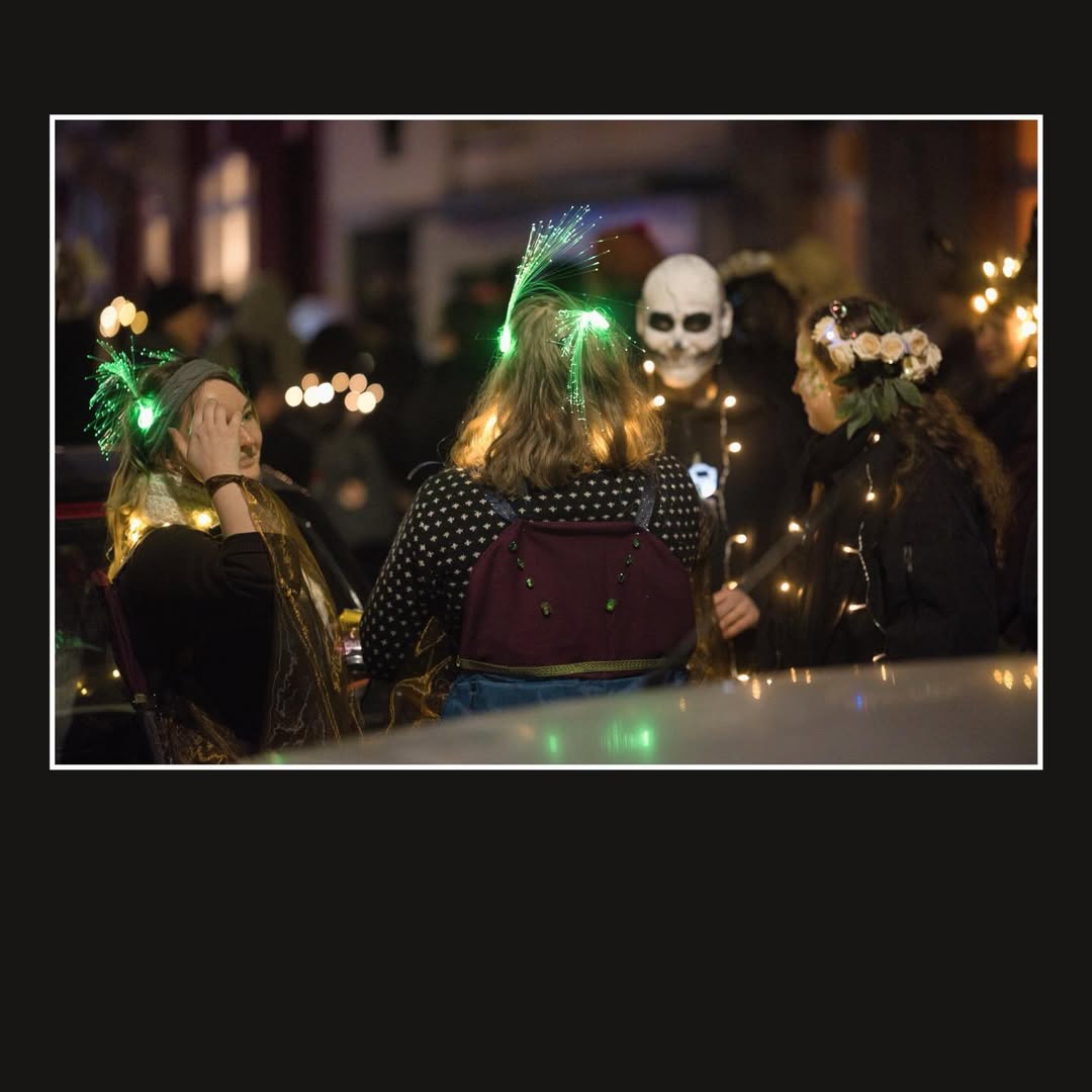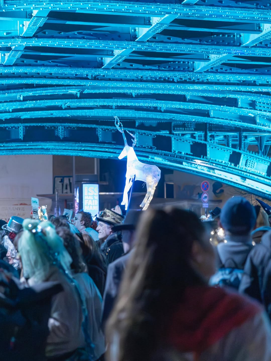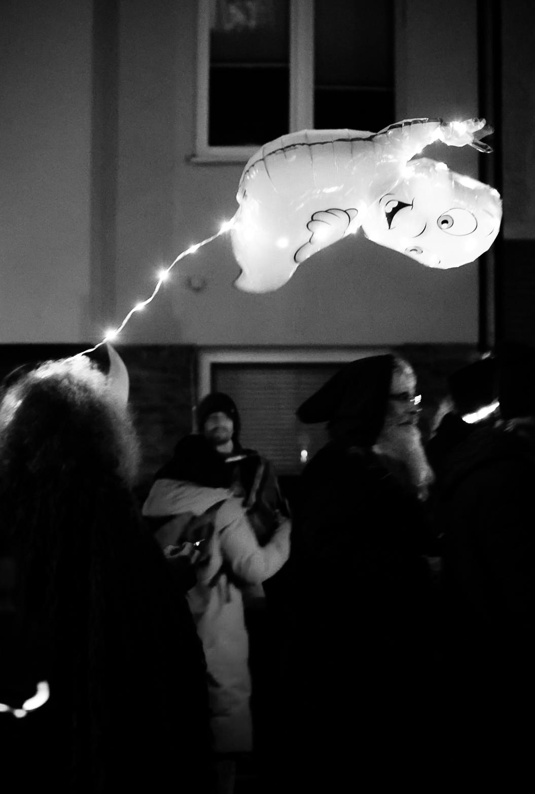 Zwischen 15 und 20 Fotograf:innen haben sich um 19 Uhr in Nippes zusammengefunden – und sich dann schnell im Strom verloren. Jeder auf der Jagd nach dem eigenen Moment. Gruselige Kostüme, schräge Verkleidungen, Lichtinstallationen direkt am und um den Körper, laute Musik, und zwischendrin Transparente gegen steigende Mietpreise. Köln halt. Aber Köln auf 180.