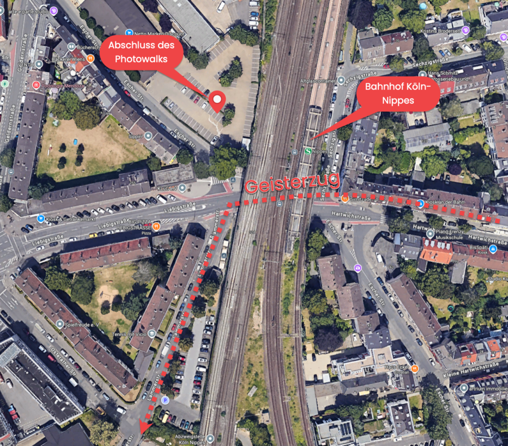 - Ende: ca. 21 Uhr – Parkplatz vom Netto am Bahnhof Köln Nippes (Escher Str. 88, 50739 Köln) – Google Maps Link