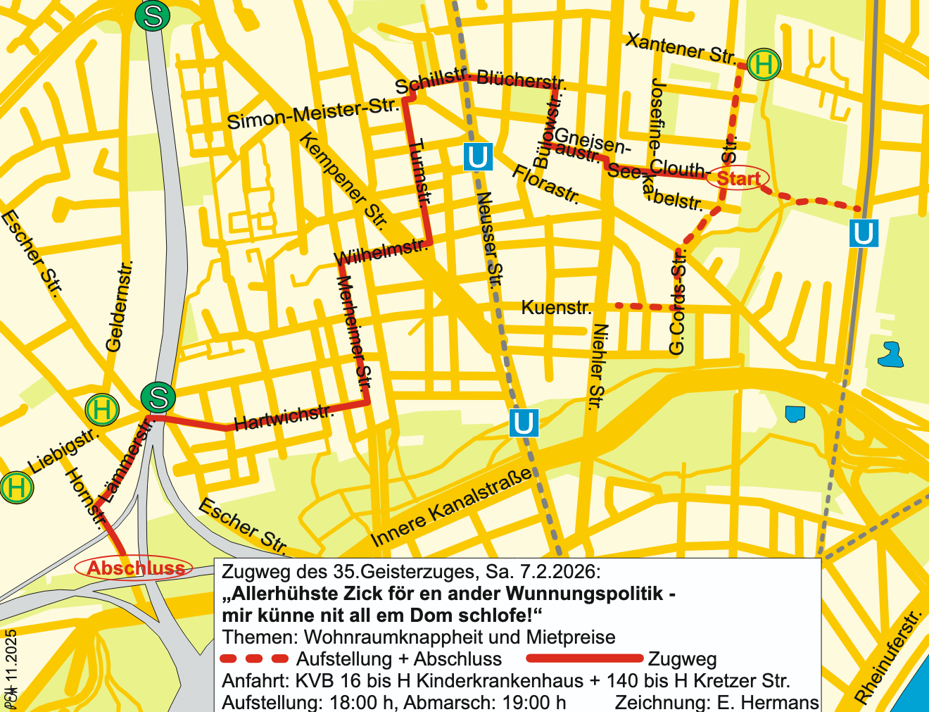 Die Strecke ist etwa 3,5 bis 4 Kilometer lang. Nicht jeder muss oder kann das komplett durchziehen – völlig okay. Wenn ihr früher nach Hause wollt oder müsst, kein Problem. Jeder hat seine eigene Anreise, wir verstehen das. Wir ziehen bis zum Ende durch und gehen danach noch auf ein Kölsch, aber macht das, wie’s für euch passt.